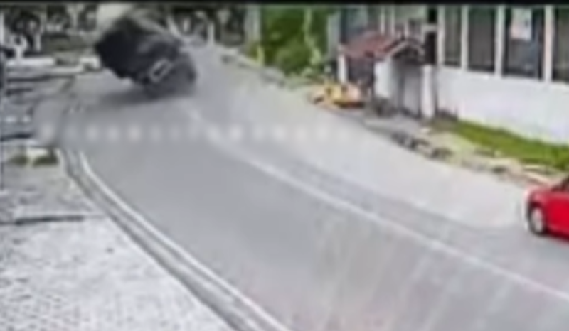 Câmeras de segurança flagraram o momento em que o veículo maior, no sentido contrário, vem virando e acaba tombando na pista. Segundo informações, a carreta transportava carga de MDF.