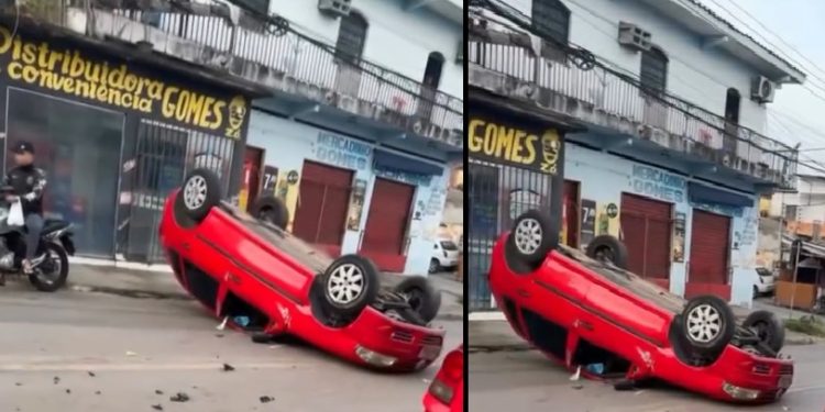 MANAUS – Um carro capotou na manhã desta quarta-feira (18), na avenida Vera Cruz, bairro Lírio do Vale, zona centro-oeste de Manaus, e a imagem viralizou nas redes sociais.