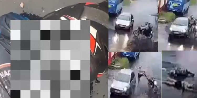 A imagem da batida de uma moto contra um carro foi captada por câmeras de segurança numa esquina da comunidade Nossa Senhora de Fátima, que fica no bairro Cidade Nova.
