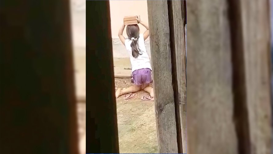 Nas imagens é possível ver a criança sendo sufocada com um pedaço de pano. Em outro momento, ela está de joelho sob pedras com um tijolo na cabeça.