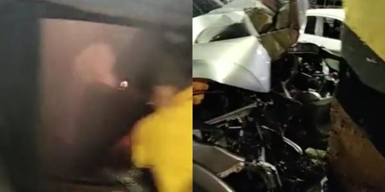 Por pouco o carro não pegou fogo. Toda a ação foi registrada por testemunhas. No vídeo é possível ver o homem aparentemente desmaiado e a população tentando tirá-lo de dentro do veículo com uma pedra.