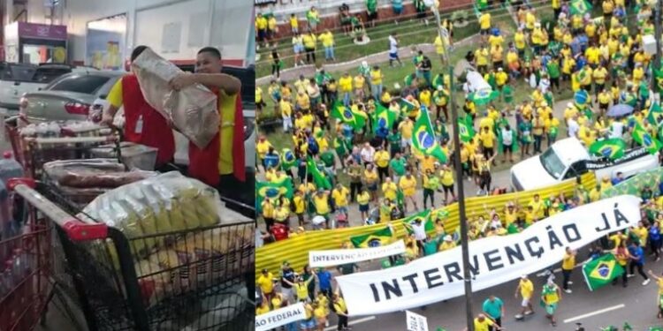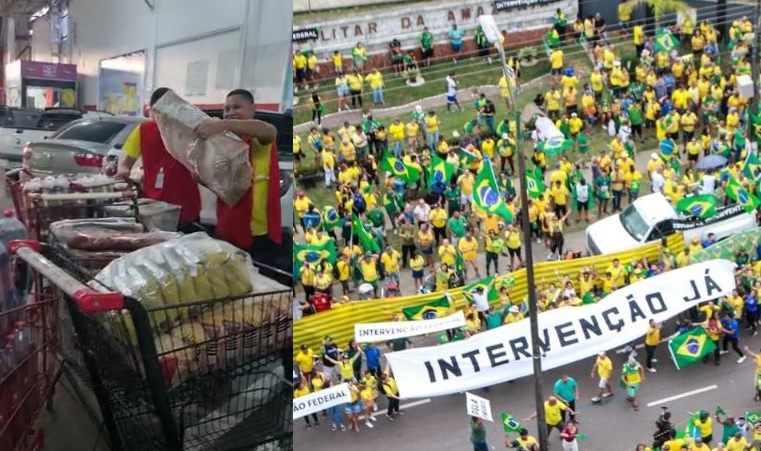 MANAUS (AM) – Um vídeo que começou a circular nesta sexta-feira (11) mostra uma grande doação de alimentos e suprimentos, avaliados em mais de R$ 5 mil, sendo doados pela rede de supermercados Baratão da Carne, em Manaus, para o protesto antidemocrático que acontece em frente ao CMA, na Ponta Negra, Zona Oeste.