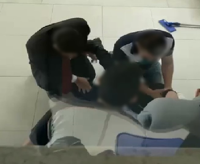 Eles trancaram as portas de uma sala e filmaram pela janela superior o menino de 12 anos sendo imobilizado por professores e funcionários.