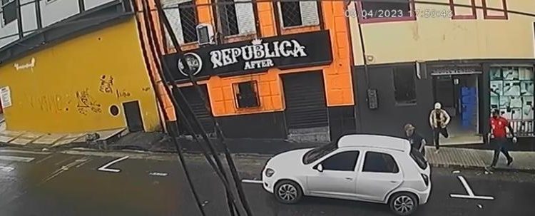 Nas imagens é possível ver os criminosos chegando em um carro branco, três homens armados descem do veículo e entram no bar.