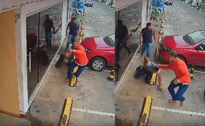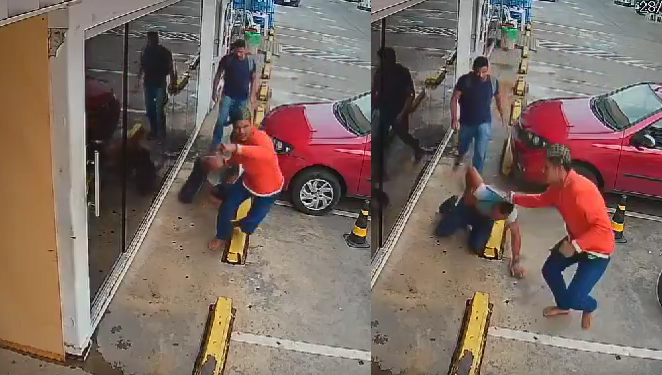 MANAUS (AM) – Imagens de câmeras de segurança registraram o momento em que um gerente de um posto de combustíveis na avenida Torquato Tapajós, Zona Norte de Manaus, foi rendido por criminosos e assaltado. Ele foi jogado no chão, arrastado e levou coronhada na cabeça.