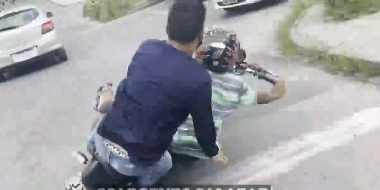 MANAUS (AM) – Dois homens suspeitos de trafegar em uma moto roubada foram parar nas redes sociais após serem derrubados durante uma ação policial em Manaus. A dupla se estatela no chão.