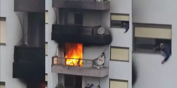 As chamas já tinham tomado todo o apartamento e o garoto não tinha mais para onde ir. Um homem tenta alcançá-lo, se espreguiçando pela janela do andar abaixo, mas sem sucesso. Utilizando uma escada, os vizinhos chegam até a sacada em chamas e um homem rasga a tela de proteção.