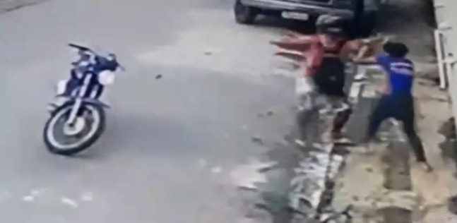 Nas imagens é possível ver o susto que a mulher leva, deixa o celular cair no chão e acaba ficando sem o aparelho. O bandido deixa o facão cair, pega o aparelho da vítima e vai embora na moto, deixando a arma branca para trás.