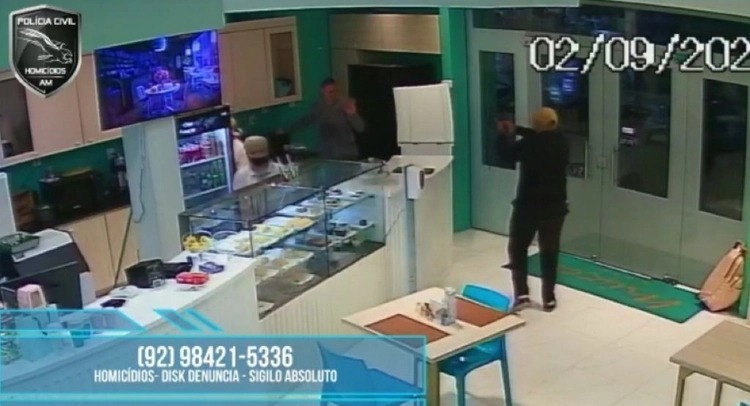O vídeo registrou toda a ação do criminoso. Ele chega de moto, estaciona do lado de fora e entra no local fingindo ser cliente. Dois clientes saem do estabelecimento e duas funcionárias aguardam o homem fazer o pedido. Mas ele saca uma arma e atira várias vezes contra o empresário.