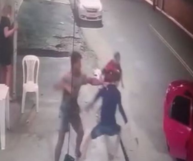 Nas imagens, um rapaz que estava com um a mulher no local, é surpreendido por bandidos em um carro vermelho, de placa não identificada. Um dos assaltantes sai do veículo e aponta o que parece ser uma arma para o homem, que reage e acaba entrando em luta corporal com o criminoso.