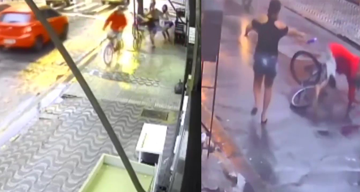 Nas imagens, duas mulheres caminham pela calçada quando o criminoso que estava de bicicleta passa e rouba o celular delas. Uma das vítimas decidiu dar golpes de guarda-chuva no suspeito para tentar recuperar o aparelho, ele cai no chã e é agredido pelas vítimas e populares que apareceram na hora da ação criminosa, Veja;
