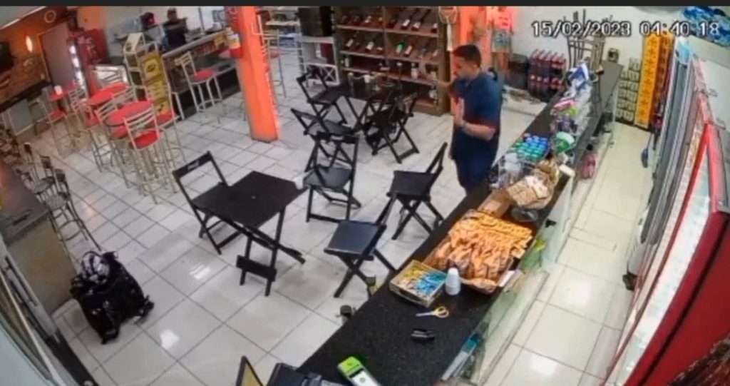 Câmeras de segurança registraram toda ação. O policial apontando a arma e disparando contra a vítima que cai no chão.