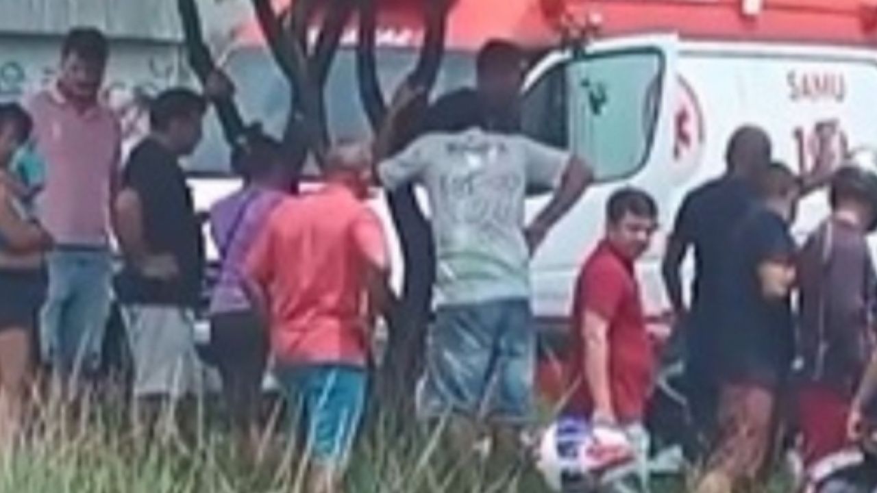 Um vídeo que circula nas redes sociais mostra a mulher caída no chão aguardando ser socorrida.