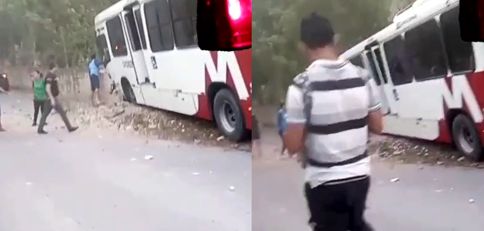 O veículo estava lotado de passageiros, que por muito pouco não se feriram com gravidade. Uma passageira narra o vídeo e mostra a fila de pessoas ao lado do veículo.