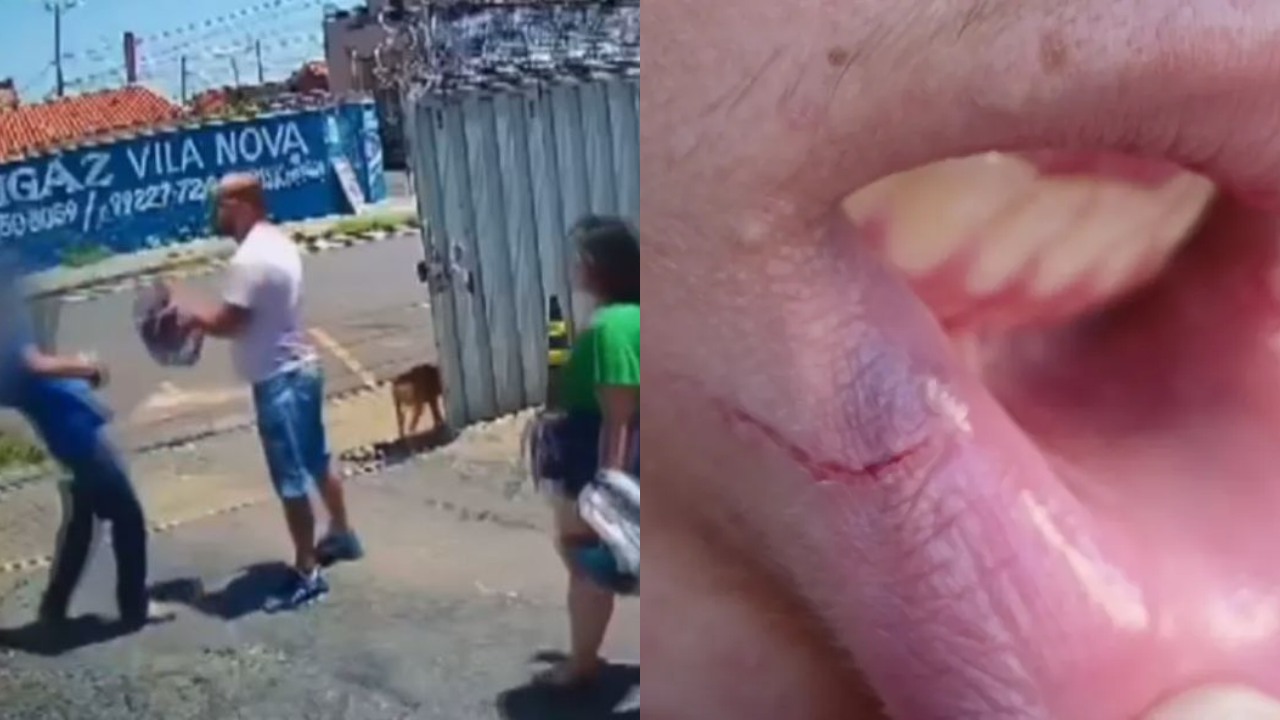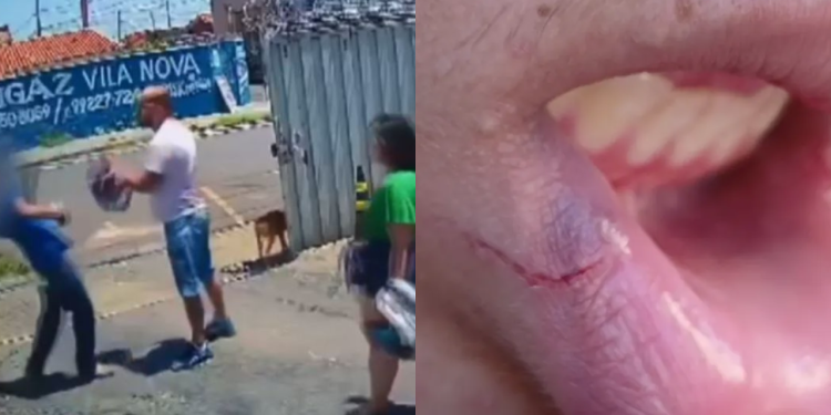 Nas imagens ele vai para cima do filho e o acerta com o capacete, o menino corre para o meio da rua e o patrão dele tenta defendê-lo, mas a madrasta e o pai continuam indo para cima da vítima que corre para um terreno para fugir das agressões.