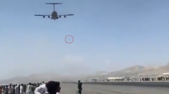 Imagens mostram afegãos correndo ao lado do transporte do C-17 enquanto ele se prepara para decolar com cerca de uma dúzia segurando o compartimento das rodas.
