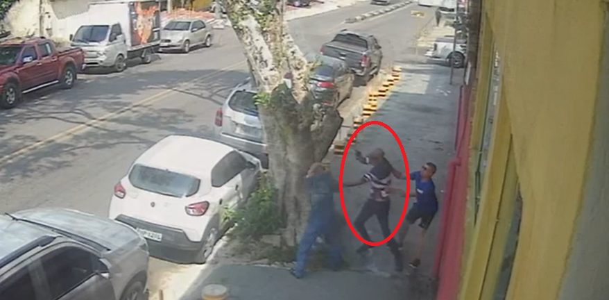 Nas imagens, Erwin caminha com um homem ao lado pela Alameda Santos Dumont, no bairro Santos Dumont, Zona Oeste de Manaus, após terem saído do local onde almoçaram. É quando Hewerton passa pela rua de camisa listrada e boné, na direção contrária.