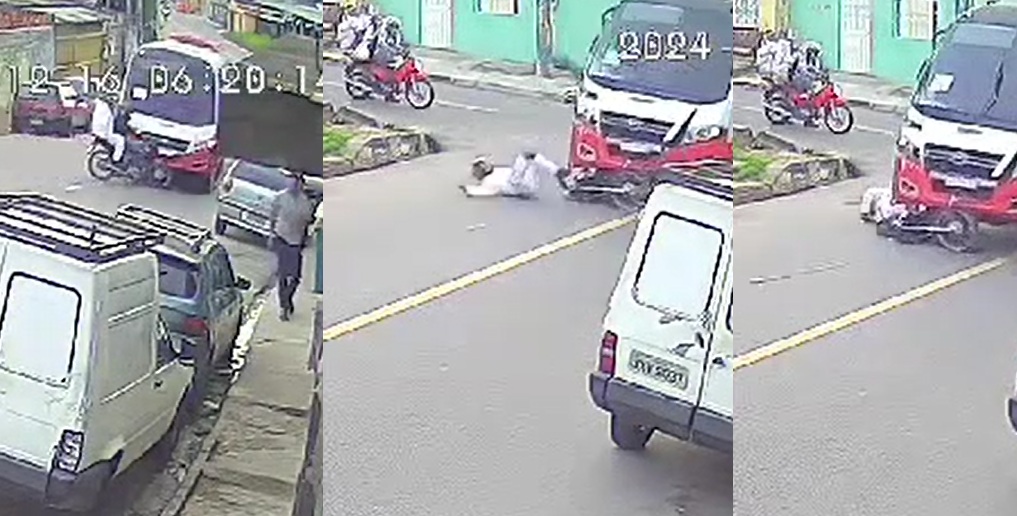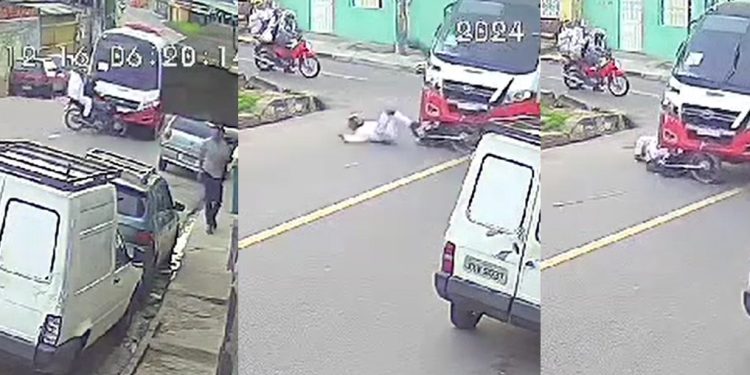 MANAUS – Um motoqueiro passou na frente de um ônibus nesta segunda-feira (16), no bairro Armando Mendes, zona leste de Manaus. Condutora e passageiro caíram e foram arrastados pelo micro.