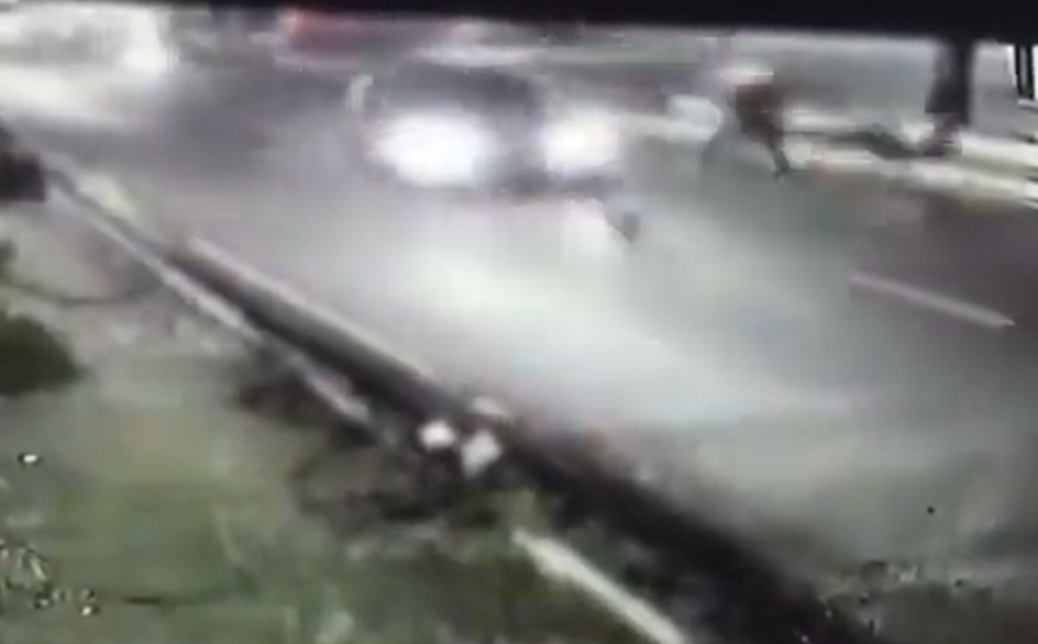 Nas imagens, ele está reduzindo a velocidade e vai tentar passar pelo canteiro da pista. O condutor do carro não consegue frear e acaba arremessando no rapaz na pista.