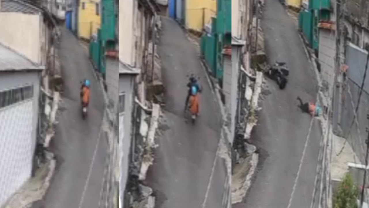 No vídeo, ele aparece com uma mulher na garupa na rua Travessa Hermelinda Queirós, no bairro Nova Esperança. Assim que o piloto acelera e cai, o garupa sai ‘rebolando’ ladeira abaixo.