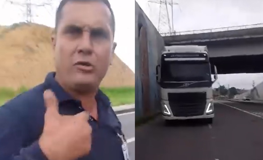 O motoqueiro filmou a placa e xingou o caminhoneiro, que também xingou o motociclista. “Pneu do cara ai todo careca, fazendo o cara se acidentar ai. Seu otário”, disse o motociclista.