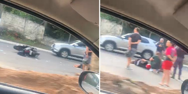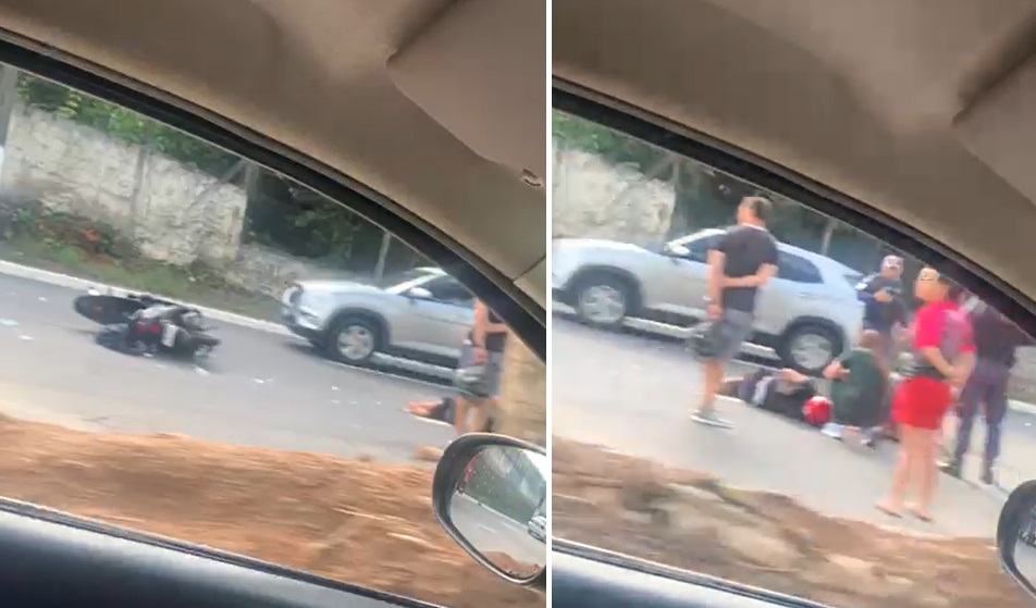 Um motorista que passava pelo local filmou a situação do motoqueiro. Os nomes dos envolvidos e o estado de saúde do rapaz não foram informados.