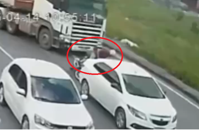 O homem vai parar debaixo de um caminhão, que por pouco não passou por cima dele com as rodas. Ele, no entanto, se feriu nas costas.