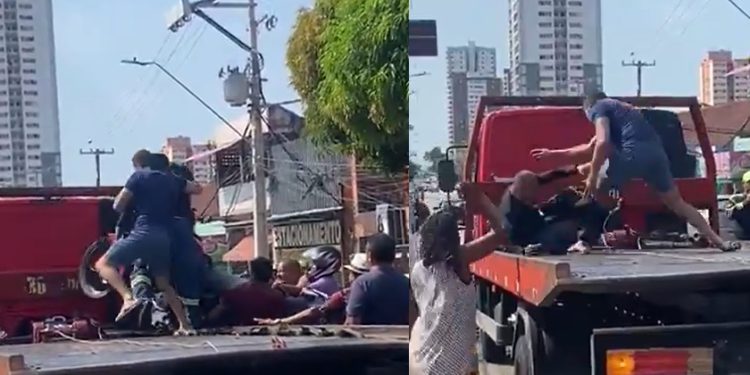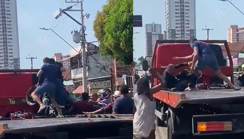 BRASIL – Um motoqueiro surtou e meteu um mata-leão num agente de trânsito em Belém neste fim de semana. O homem não aceitou que a moto dele fosse levada.