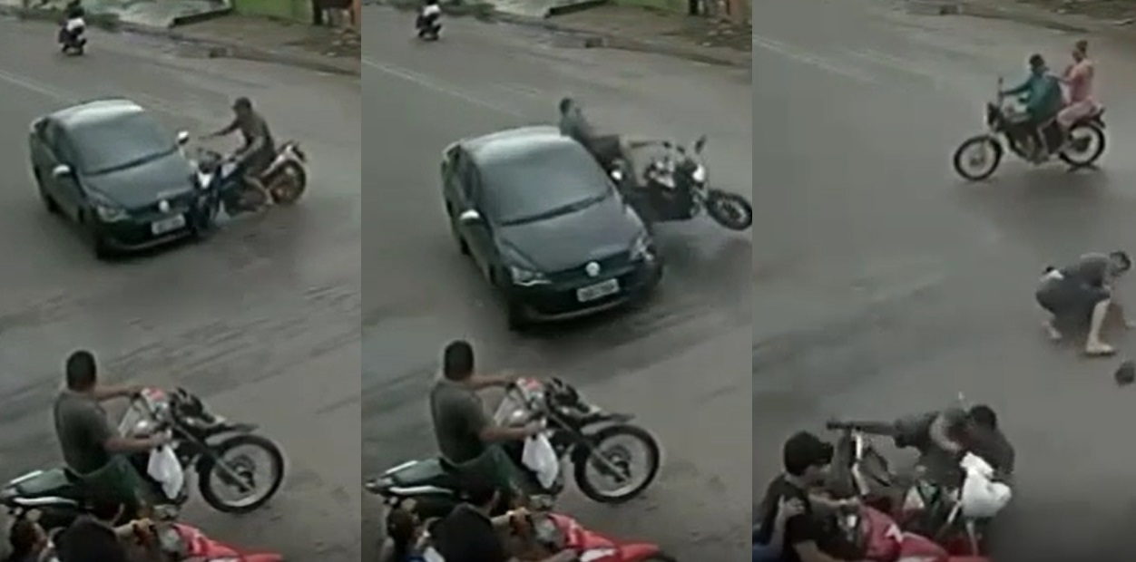 A imagem mostra o acidente e chama a atenção pela imprudência dos condutores, inclusive dos motoqueiros, que estão sem capacaete.