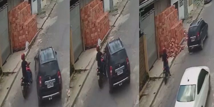 MANAUS – Mais uma flagrante da insegurança e imprudência no trânsito foi registrado nesta véspera de Natal em Manaus, onde um motorista fechou um motoqueiro na rua dos Ciprestes, no bairro Novo Aleixo, e depois de bater em uma pilha de tijolos fugiu.