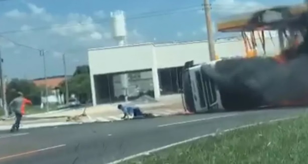 GOIÁS – Imagens de câmeras de segurança mostraram a aflição de um motorista se rastejando para fugir de um caminhão em chamas prestes a explodir nesta quinta-feira (29), na BR-060, em Goiânia. Por sorte ele conseguiu sair de perto do fogo e se feriu levemente. O caminhão transportava 37 mil litros de etanol.