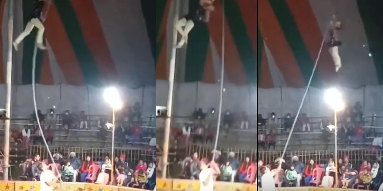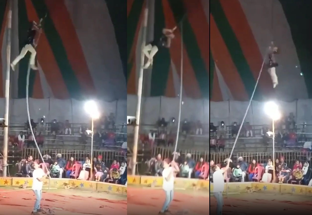 MUNDO – Uma mulher foi estrangulada na Índia durante um tradicional número de circo, onde ela gira amarrada à uma corda. As imagens caíram nas redes sociais nesta terça-feira (11).