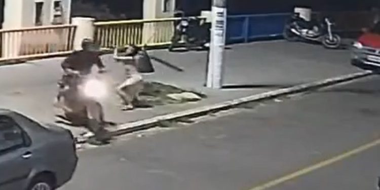 O homem estaria cometendo arrastões e levando os celulares e cordões das pessoas. Mas a mulher mandou a madeirada nele, que montou na moto e vazou.