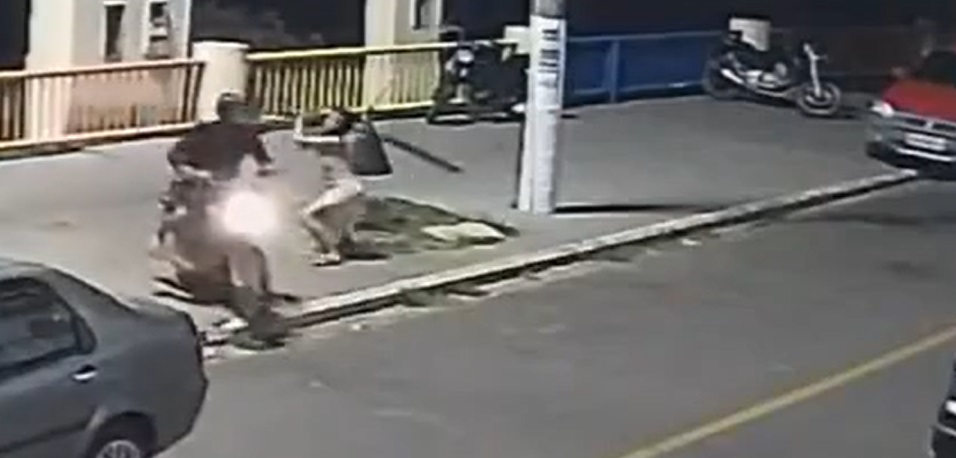 O homem estaria cometendo arrastões e levando os celulares e cordões das pessoas. Mas a mulher mandou a madeirada nele, que montou na moto e vazou.