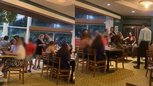 A situação foge do controle quando ambos passam a trocar empurrões entre as mesas do restaurante. Em um dos momentos mais críticos, a mulher se volta contra clientes próximos, derrubando mesas e cadeiras no processo.