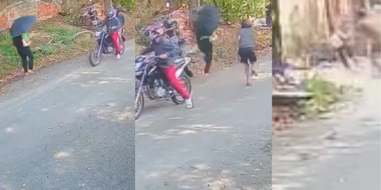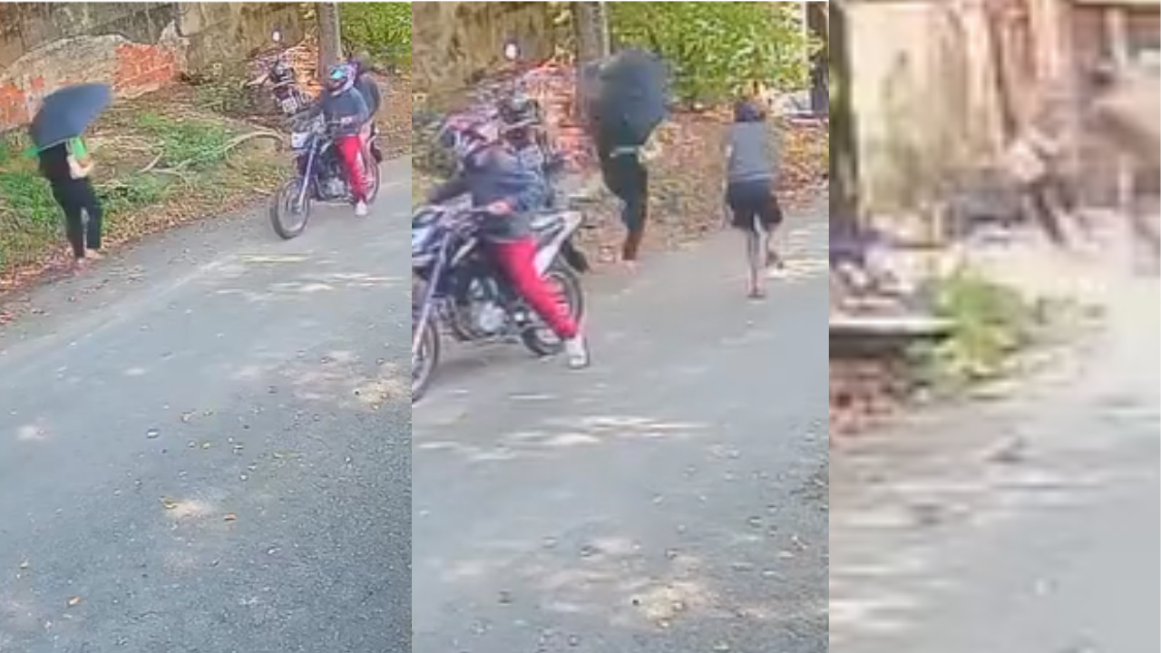 Nas imagens a mulher desce a rua, enquanto dois homens em uma moto sobem a ladeira na direção contrária. O garupa desce do veículo e anuncia o assalto, mas a vítima tenta correr.