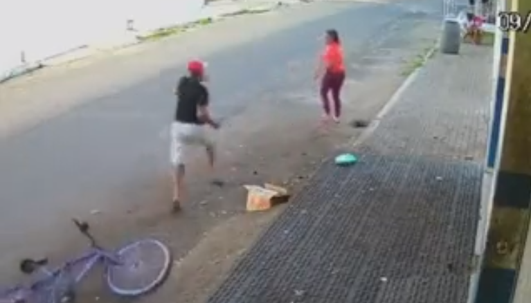 Câmeras de segurança filmaram o crime e mostram a vítima andando pela rua quando o cunhado chega de bicicleta. Ele desce e vai para cima da mulher, iniciando a agressão usando uma faca.