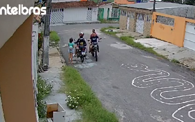 Uma câmera de segurança filmou a ação dos criminosos, por volta das 11h. Eles estavam numa motocicleta e a vítima com o mototaxista já estavam parados na frente de uma residência e ela estava entregando o capacete.