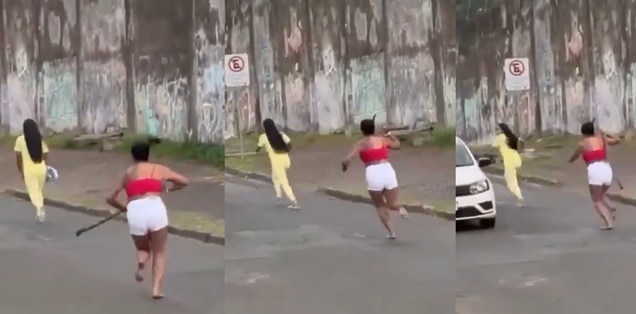 A mulher esperou a presidiária sair e correu atrás dela com um pedaço de pau. Segundo as más línguas, ela estava levando galhada da bandida, que estaria pegando o marido dela antes de ser presa.