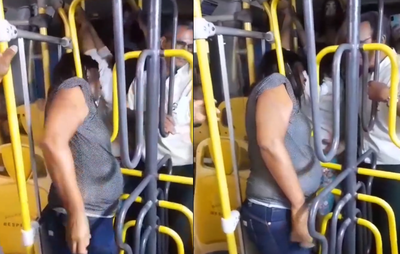 Os passageiros ficam agitados e o motorista tenta ajudar a passageira, que parece calma. Uma outra mulher pede que todas desçam para que a situação seja resolvida. Não foi informado como ela conseguiu sair e nem se acabou se machucando.