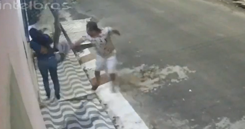 Imagens de câmeras de segurança mostram a vítima tentando fugir do agressor, que a persegue e a alcança. Sem piedade, ele desfere violentas batidas com o capacete na cabeça da mulher, que cai no chão, ensanguentada. Testemunhas que passavam pelo local intervieram para socorrê-la.
