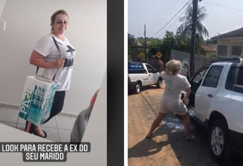 Alterada, a esposa atual sai de dentro da residência com um galão de tinta branca e joga na outra mulher, sujando todo o veículo. c que se defende, dizendo que não está fazendo nada.