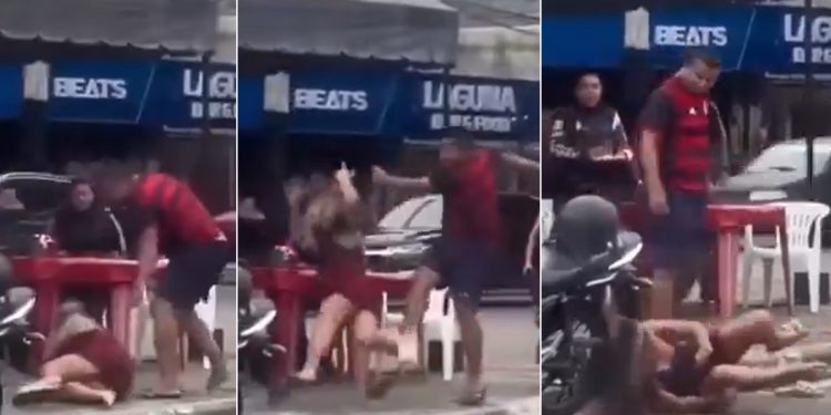 Uma outra mulher estava com o homem, que só parou porque outras pessoas entraram para apartar a porrada.