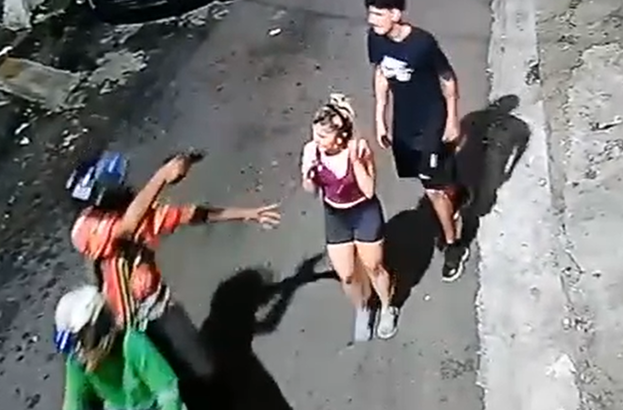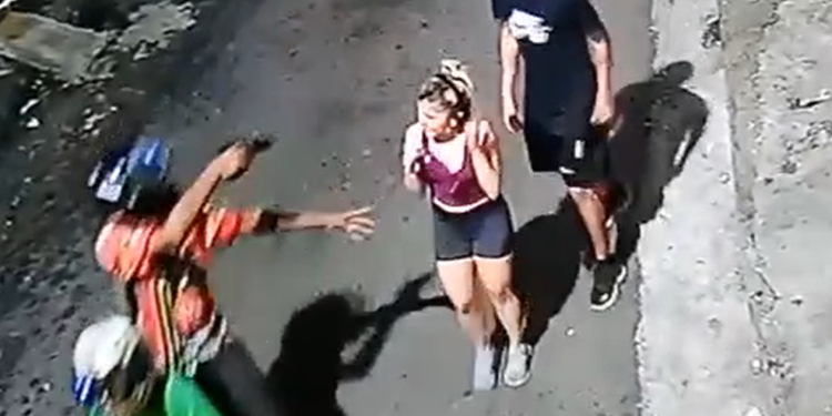 O amigo dela percebe a ação e corre, enquanto a moça entra os fones e o celular dela. Visivelmente apavorada, ela entrega tudo.