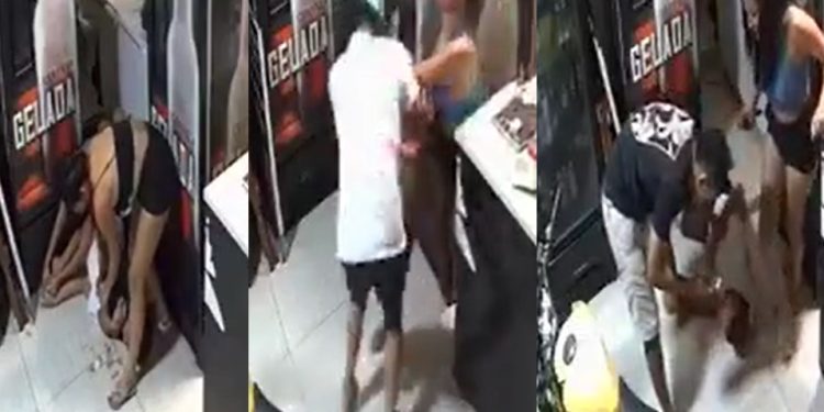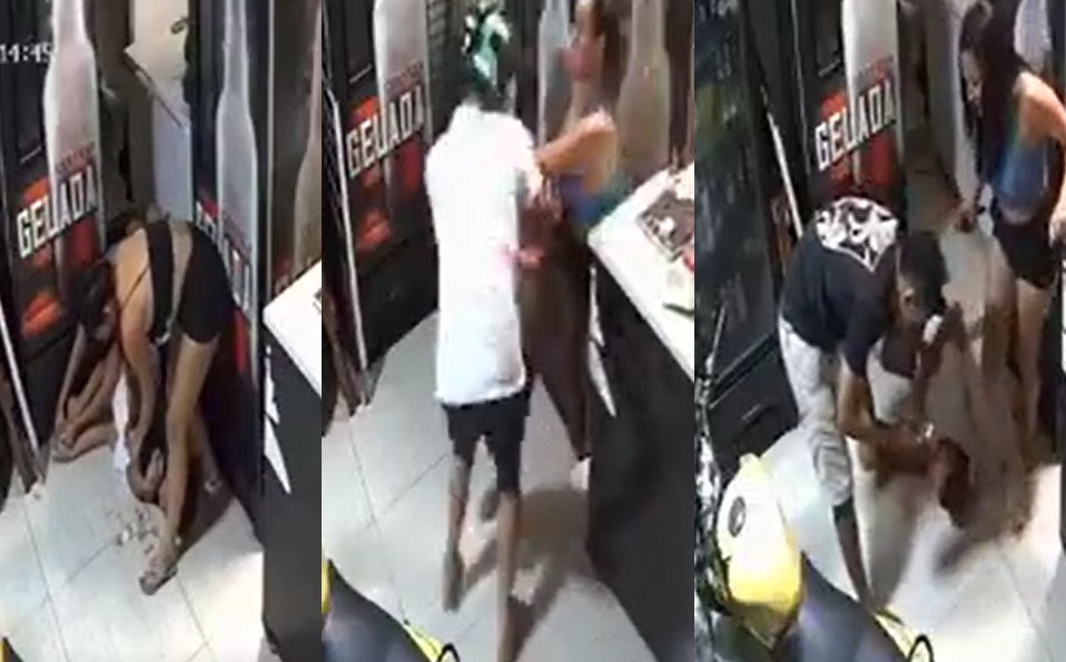 As imagens mostram o ataque ao criminoso, a hora em que ele foi rendido e, mesmo com a arma, um outro homem aplica um mata-leão e ela pega o frasco de pimenta no balcão.