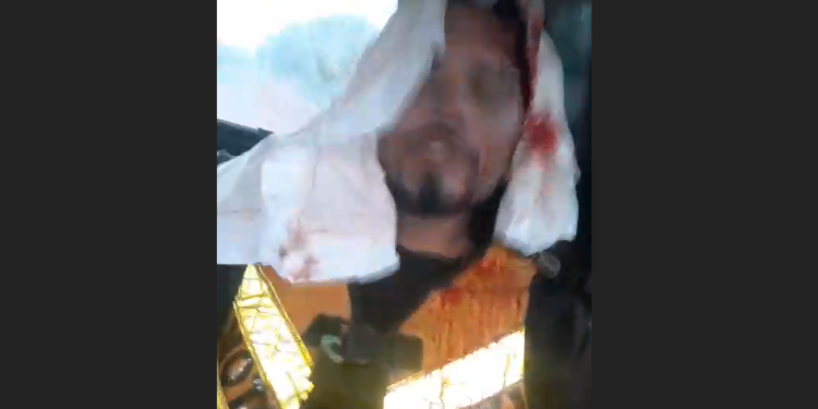 Um vídeo mostra o homem abatido com o ocorrido e com um pano na cabeça com bastante sangue.