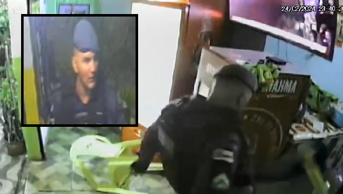 MANAUS (AM) – Uma abordagem truculenta de um policial militar no último sábado (24), em um bar no bairro Compensa, Zona Oeste, foi registrada por câmeras de segurança. Nas imagens, o policial chuta, quebra objetos e aponta um fuzil para as pessoas, não livrando até uma criança.