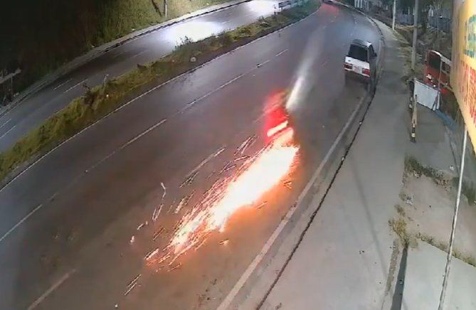 Nas imagens, o carro estava estacionado perto da calçada, próximo de uma curva. Momentos antes, um ônibus passa pelo local e em seguida a motocicleta passa em alta velocidade, inclusive com faíscas saindo do pneu.