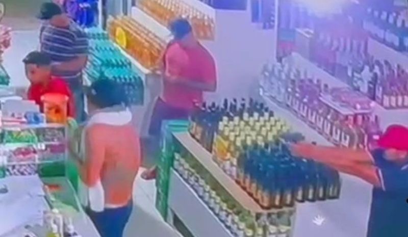 Conforme as imagens, duas mulheres estão atendendo os clientes. Uma delas, de presilha vermelha no cabelo, está conversando e é a mãe da vítima. Em seguida a vítima, sem camisa, de bermuda, boné e com uma toalha no pescoço é baleada.