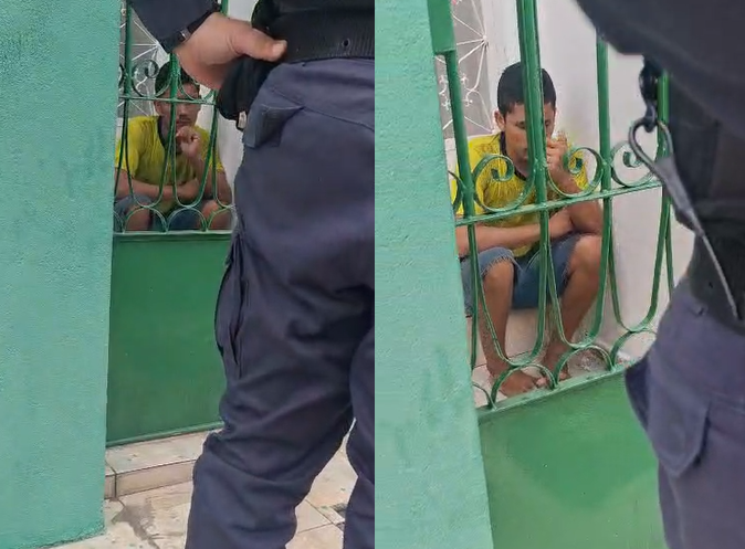 De acordo com informações, equipes policiais foram acionadas e, ao chegarem ao endereço, localizaram o homem no pátio da residência. Registros em vídeo mostram o instante da abordagem policial, onde os agentes mantêm diálogo com o suspeito, que aparentemente tentava se esconder no local.